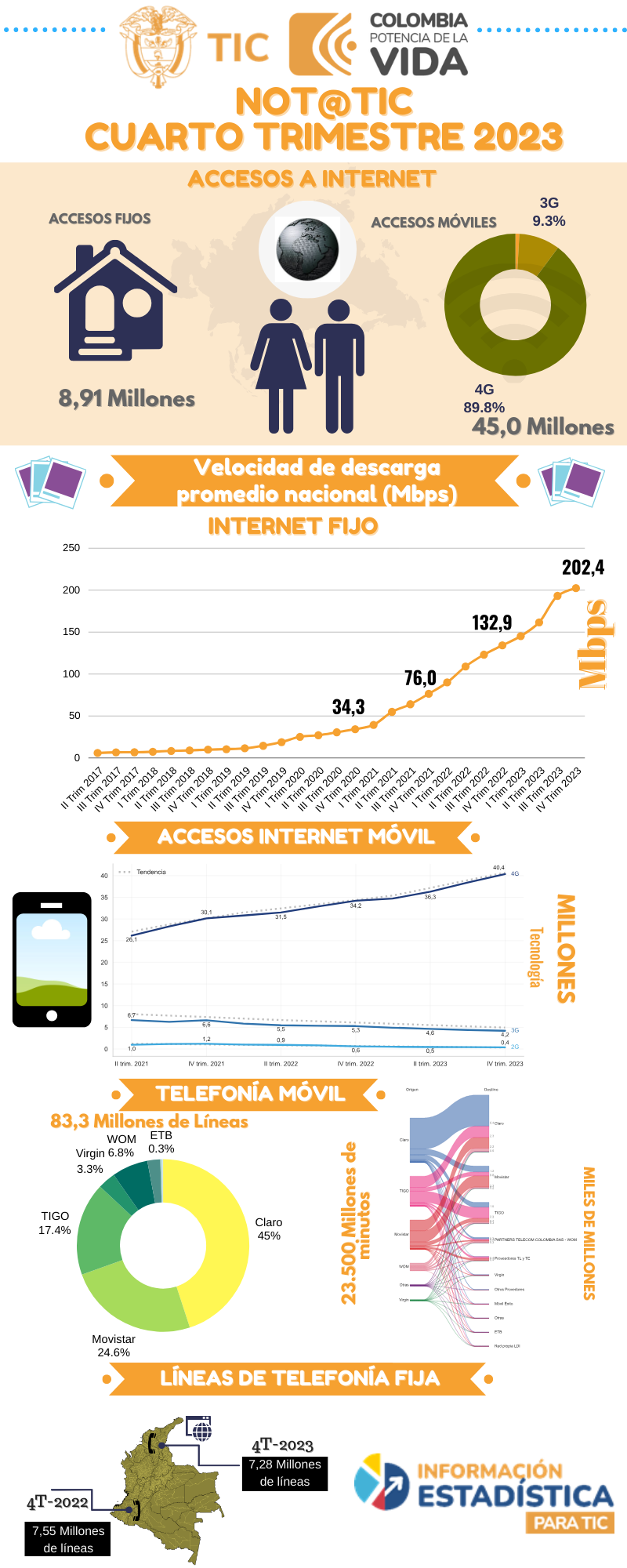 Este boletín es de publicación trimestral y presenta los datos más relevantes de los servicios de telefonía fija-móvil, internet fijo-móvil. En esta edición encontrará la información correspondiente al cuarto trimestre de 2023. Para más detalles, consulte los archivos relacionados.