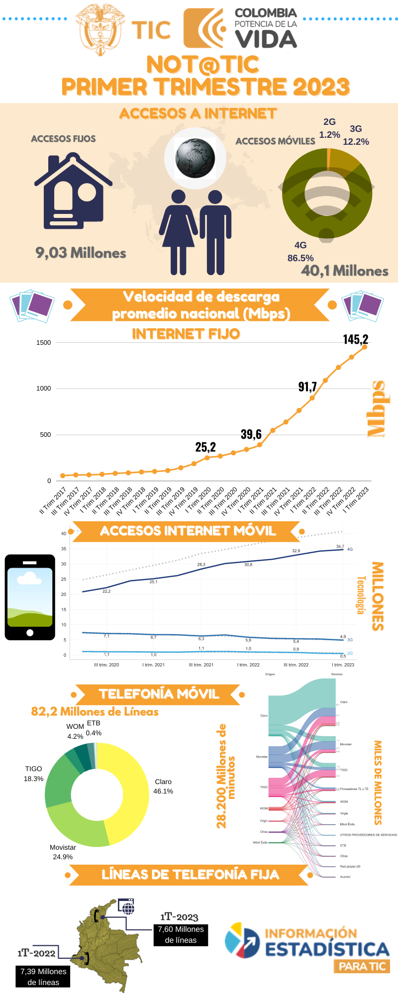 Este boletín es de publicación trimestral y presenta los datos más relevantes de los servicios de telefonía fija-móvil, internet fijo-móvil. En esta edición encontrará la información correspondiente al primer trimestre de 2023. Para más detalles, consulte los archivos relacionados.