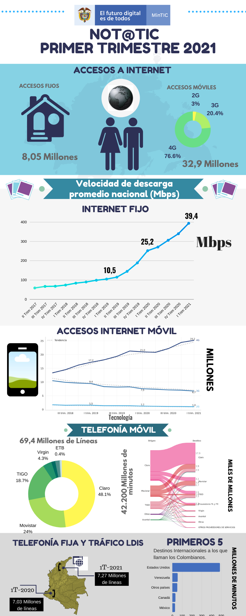 Este boletín es de publicación trimestral y presenta los datos más relevantes de los servicios de telefonía fija-móvil, internet fijo-móvil. En esta edición encontrará la información correspondiente al primer trimestre de 2021. Para más detalles, consulte los archivos relacionados.