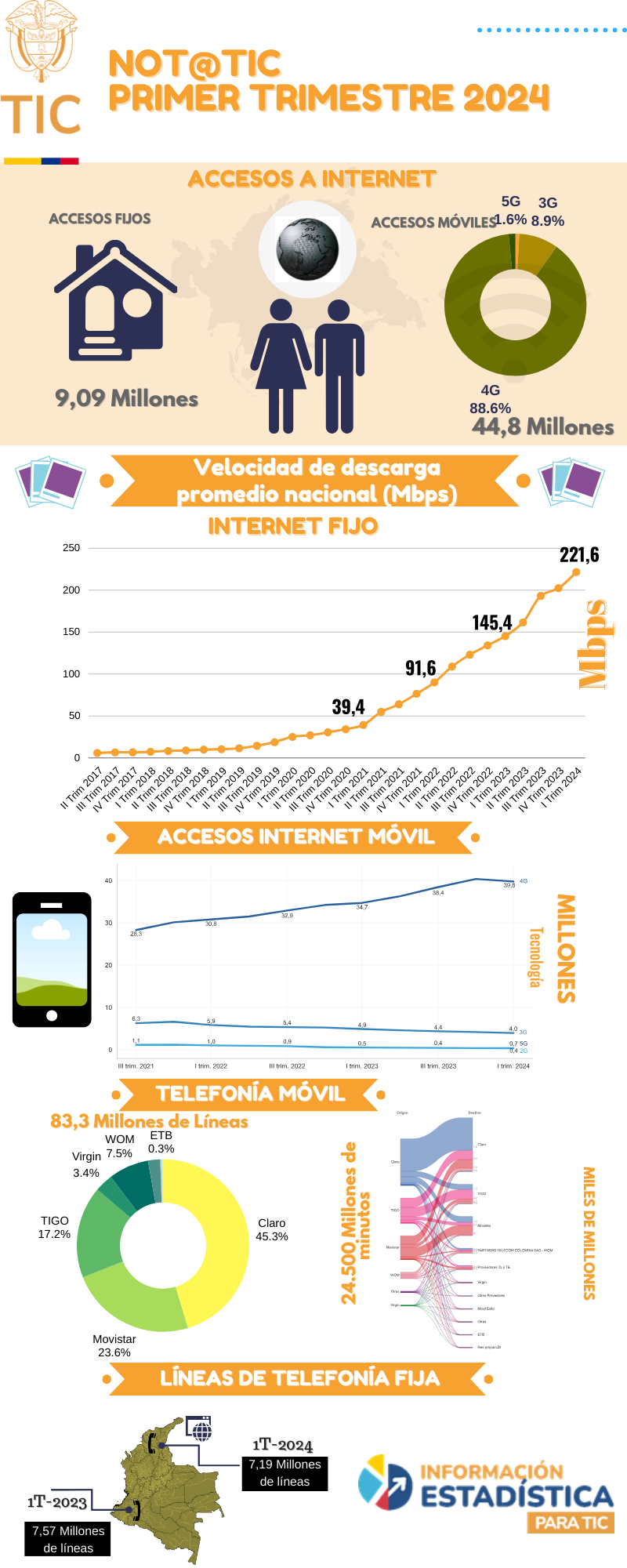Este boletín es de publicación trimestral y presenta los datos más relevantes de los servicios de telefonía fija-móvil, internet fijo-móvil. En esta edición encontrará la información correspondiente al primer trimestre de 2024. Para más detalles, consulte los archivos relacionados.