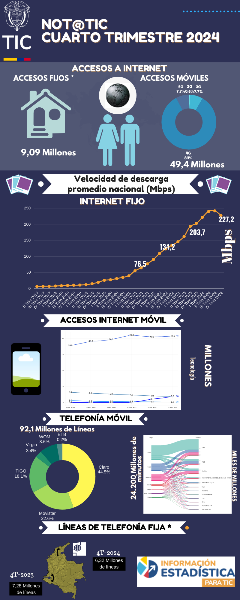 Este boletín es de publicación trimestral y presenta los datos más relevantes de los servicios de telefonía fija-móvil, internet fijo-móvil. En esta edición encontrará la información correspondiente al cuarto trimestre de 2024. Para más detalles, consulte los archivos relacionados.