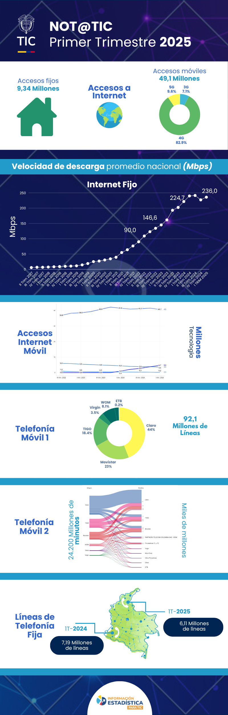 Este boletín es de publicación trimestral y presenta los datos más relevantes de los servicios de telefonía fija-móvil, internet fijo-móvil. En esta edición encontrará la información correspondiente al primer trimestre de 2025. Para más detalles, consulte los archivos relacionados.