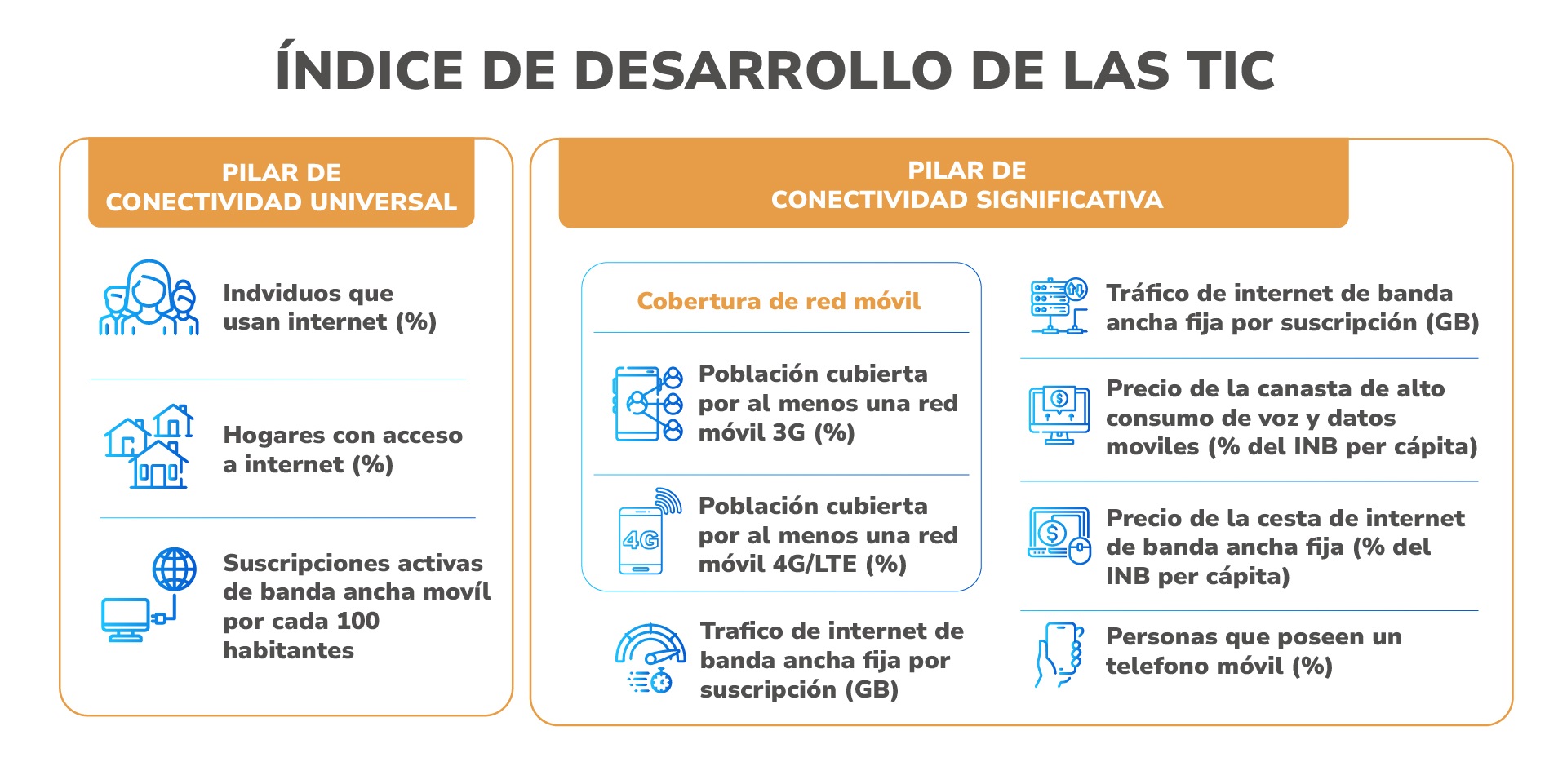 El IDI se basa en dos pilares: conectividad universal y conectividad significativa. Cada uno se compone de una serie de indicadores específicos, según la siguiente estructura:
